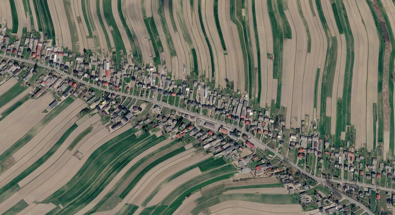 Иногда космоснимки показывают такое, что кажется глюком рендеринга. Открываешь Google Maps, приближаешься к южной Польше недалеко от Кракова, и видишь полосатое пятно, похожее на лист или кристалл. Приглядываешься — это не артефакт съёмки. Это деревня Сулошова, где 3,5 тысячи человек живут вдоль одной-единственной улицы длиной почти 9 километров. Ширина застройки — метров 50-100 по обе стороны дороги. А за ними сразу начинаются поля.