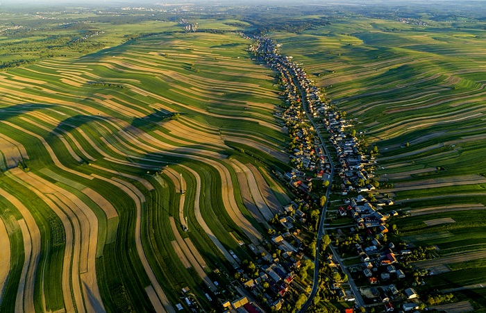 В результате деревня вытянулась вдоль единственного удобного транспортного коридора, а за домами сразу начинались сельскохозяйственные угодья. Каждый житель получил участок: узкий фасад на улицу и длинный "хвост" полей позади. Отсюда знаменитый "лоскутный" вид с воздуха — полосы разных культур (пшеница, рожь, овёс, подсолнечник, кукуруза) чередуются как полоски на ткани.